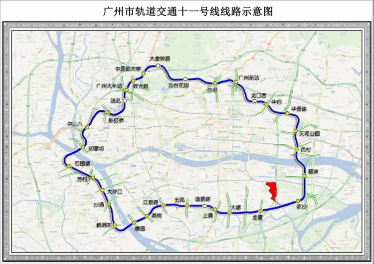 十一號線是廣州首條地鐵環線,全程44.2公里,線路穿越廣州市主城區,串聯天河、白云、越秀、荔灣和海珠五個中心區,鏈接琶洲、金融城、天河北、白鵝潭、中大國際創新生態谷等重點發展板塊,以“環”為形,勾勒出廣州的“城市圈”“交通圈”和“經濟圈”,同時也是全國首條非物質文化遺產示范線路。十一號線開通后,將大大提升廣州的交通鏈接能力以及市民的交通出行體驗,彌補廣州中心城區地鐵覆蓋不足的短板。